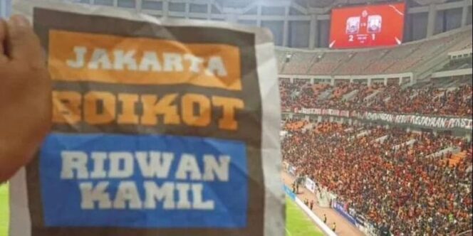 Saat laga Persija Jakarta vs Persis Solo di Stadion JIS tadi malam, Sabtu (24/08/2024). Beberapa supporter TheJak Mania membentangkan poster bertuliskan “Jakarta Boikot Ridwan Kamil”.