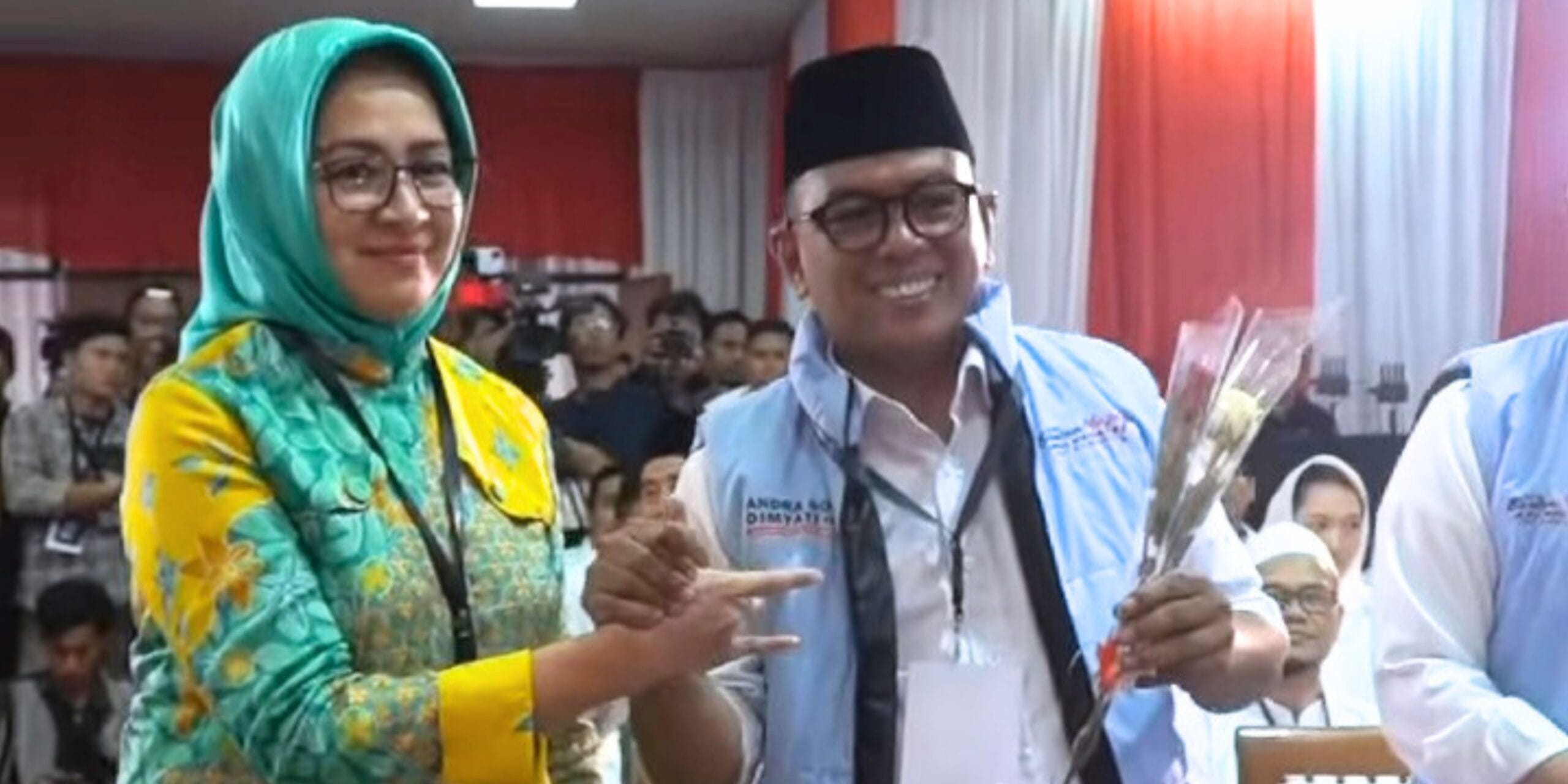 Mendengar ucapan Dimyati, pasangan Ade, Airin Rachmi Diany tampak tersenyum tipis.