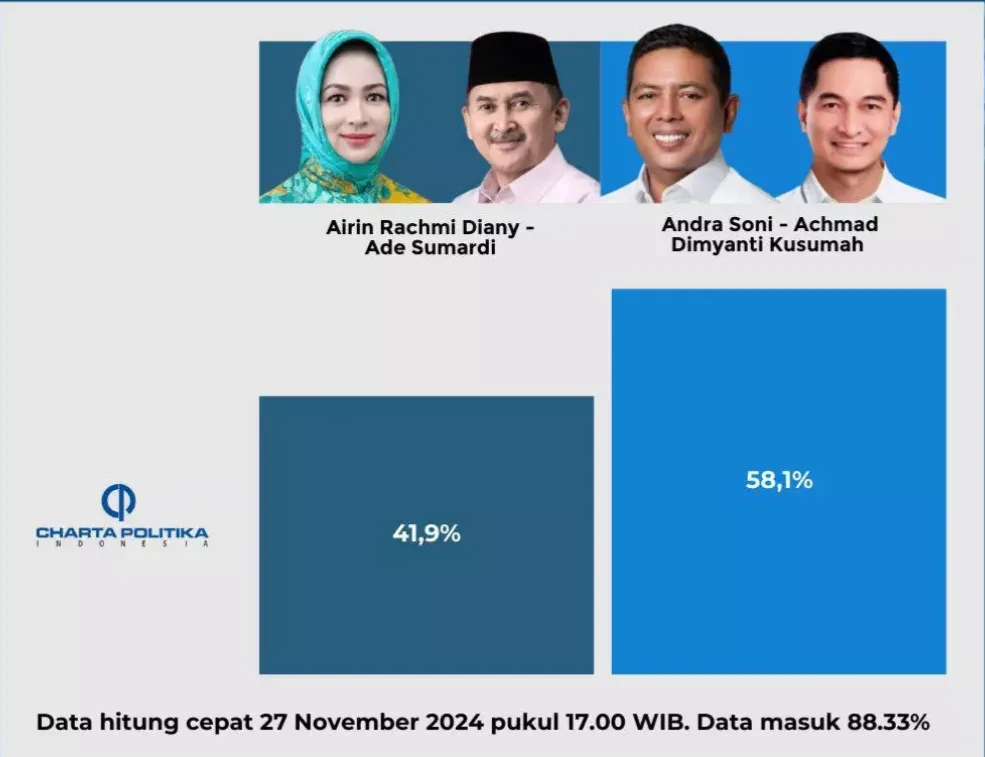 Untuk sementara,  pasangan Andra Soni – Dimyati memperoleh 58,1 persen unggul jauh dari pasangan Airin – Ade Sumardi yang memperoleh suara sebanyak 41,9 persen, dengan data yang masuk sebanyak 88,33 persen.