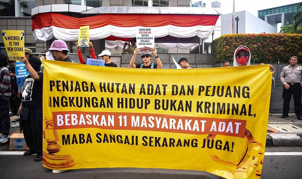 Mereka menyuarakan penolakan atas kriminalisasi terhadap 11 warga adat Maba Sangaji, Halmahera Timur, Maluku Utara, yang hingga kini masih menjalani proses hukum karena menolak ekspansi tambang nikel di tanah adat mereka.