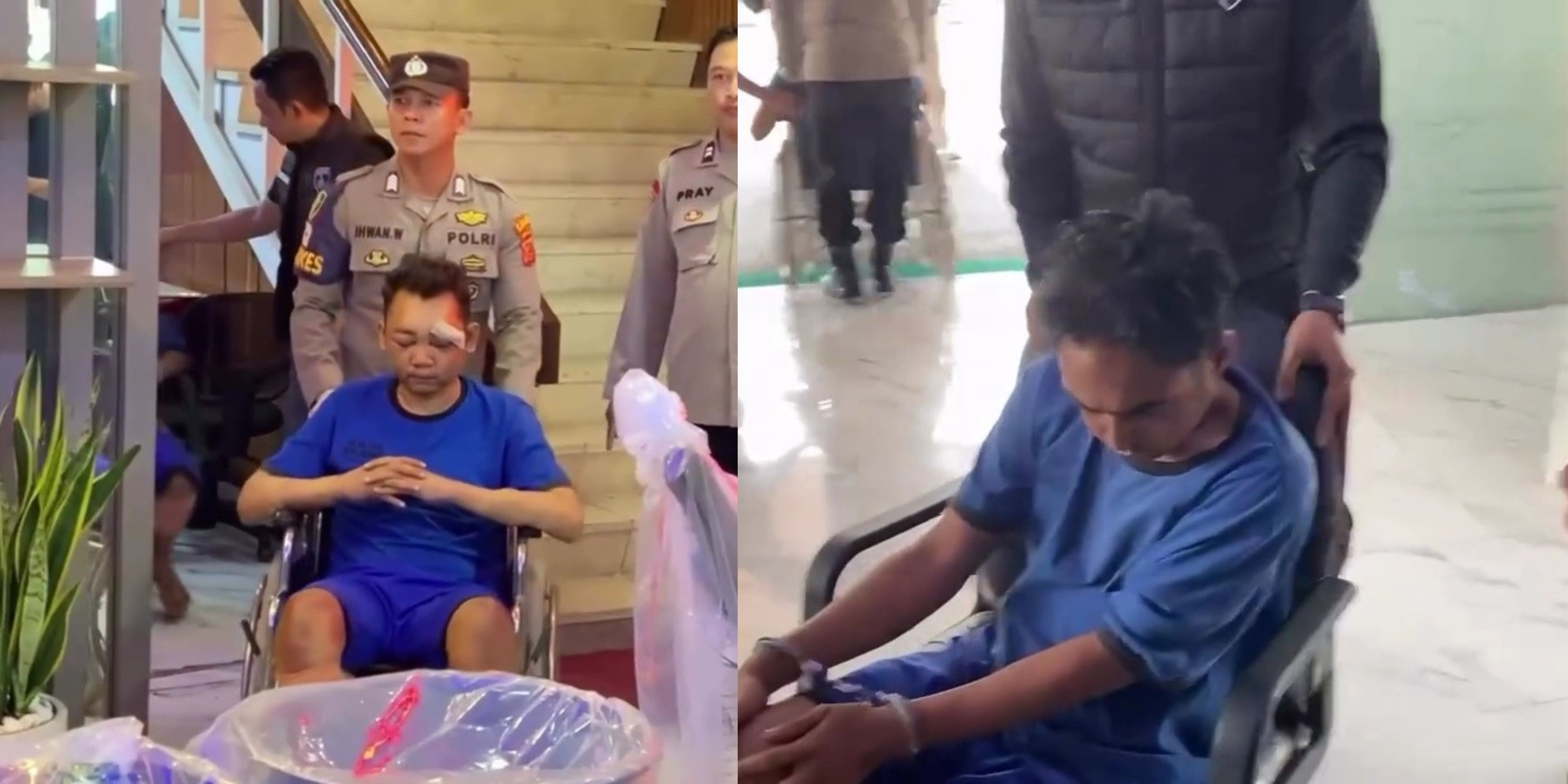 Keduanya terlihat lesu saat wajah mereka diperlihatkan oleh polisi. Kedua pelaku mengenakan baju tahanan berwarna biru, duduk dikursi roda dengan pengawalan ketat polisi.