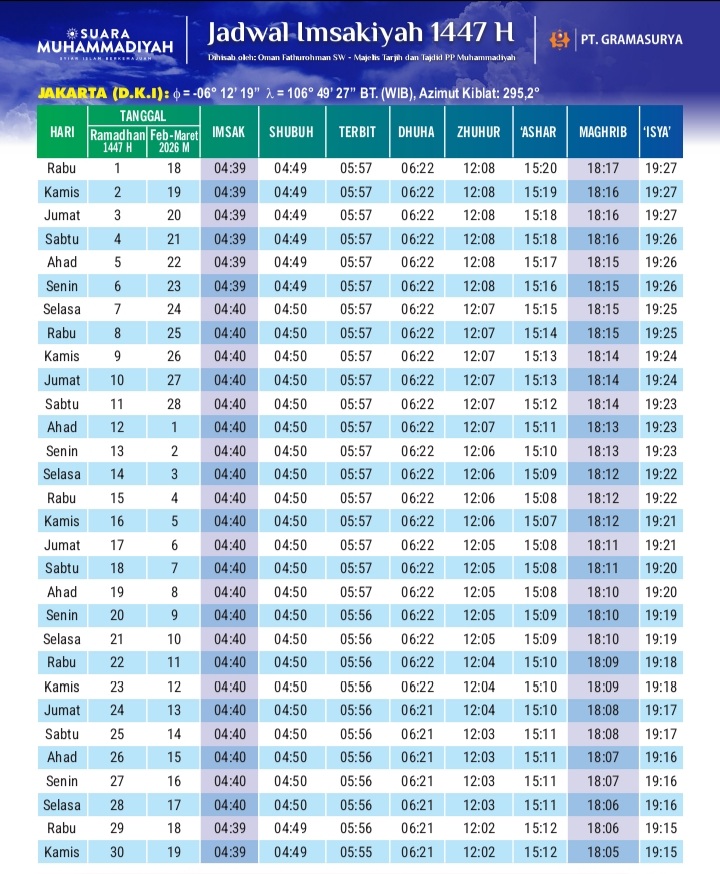 Jika ingin mengetahui dan mendownload jadwal Imsak Ramadhan 1447 H, redaksi jejaknarasi.id telah merangkum jadwal yang disusun oleh Ketua Bidang Hisab dan Iptek Majelis Tarjih dan Tajdid Pimpinan Pusat Muhammadiyah, Dr Oman Fathurohman SW, MAg.