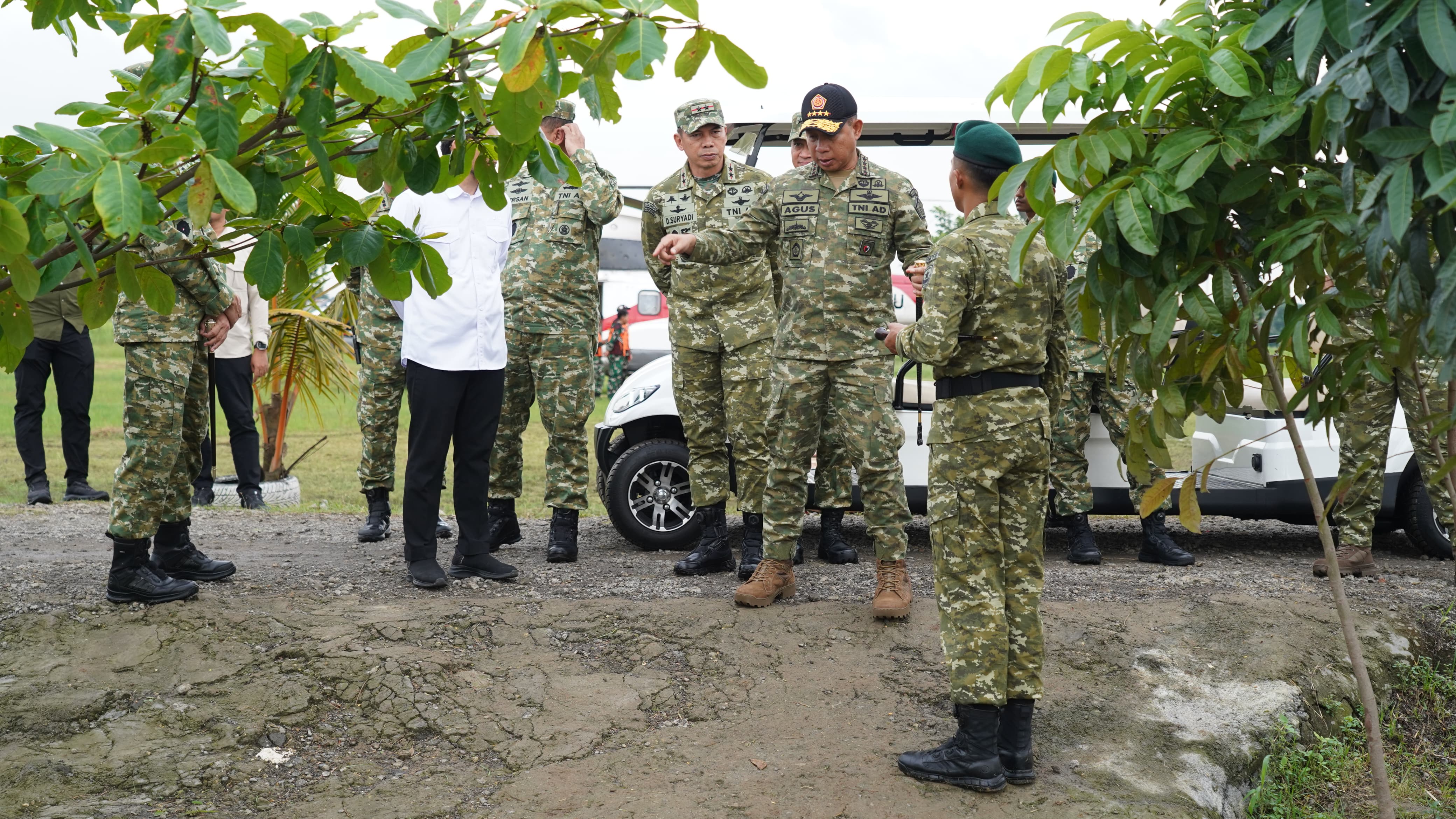 Sebelum menerima paparan dari Danyonif TP 843/PYV, Panglima meninjau fasilitas satuan, lahan perikanan yang dikelola sebagai bagian dari program pembinaan teritorial dan ketahanan pangan satuan dan melaksanakan penanaman pohon Pule.
